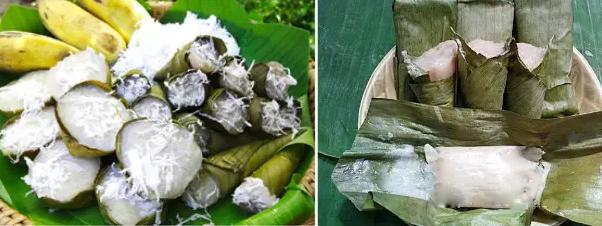 4.糯米椰糕(Kha Nom Kluay):这是一道拨开蕉叶后还带着淡紫色的糕点,主要材料是香蕉,掰开糕点,可以看到里面塞着椰丝,味道很香。