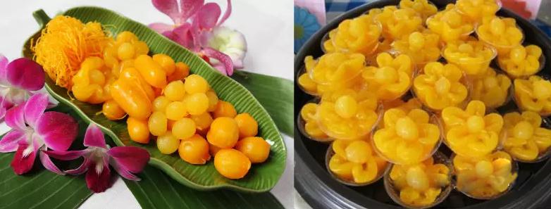 8.蛋黄甜点(Thong Yib Thong Yod):金黄圆润的小点心看起来非常可口,主要是用蛋黄、糖制成,大部分呈椭圆形,有的会做成花朵或*的样子。