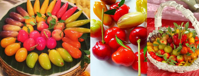 5.水果甜点(Luk Chop):这是泰国一道巧夺天工的点心,用糯米粉制成皮,再包上绿豆沙馅。外观做得就像缩小的山竹、番石榴、辣椒、茄子等泰国蔬果,外层再裹上琼脂。